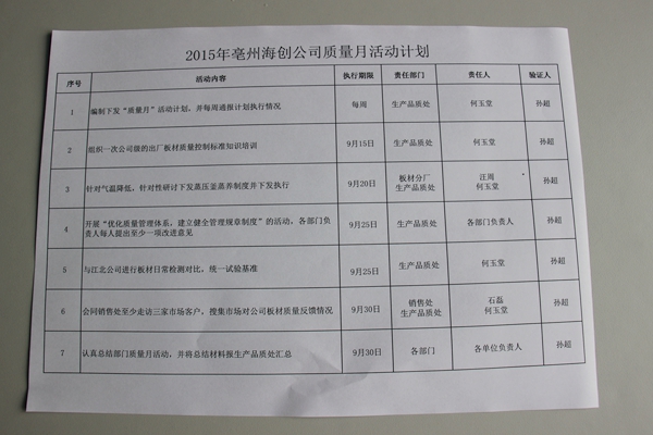 ? ? 月初,由公司領導組織相關部門研討,編制下發了2015年質量月活動計劃。按照活動計劃的安排,公司于9月上旬對出廠板材質量控制標準組織了研討修訂,并組織銷售人員學習,提高了市場銷售人員對公司板材質量及性能認知水平。