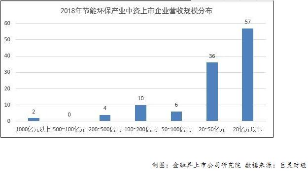 ? ? 在對截至4月30日已披露2018年營收數據的節能環保產業中資上市企業不同營收規模的企業數量情況進行分析的過程中,報告發現,在節能環保產業中資上市企業中,營收規模在1000億元以上的有2家,營收規模在500億元~1000億元之間的企業數量為0,多數企業營收規模都在50億元以下。說明我國節能環保產業企業業務規模普遍較小,行業集中度不高。