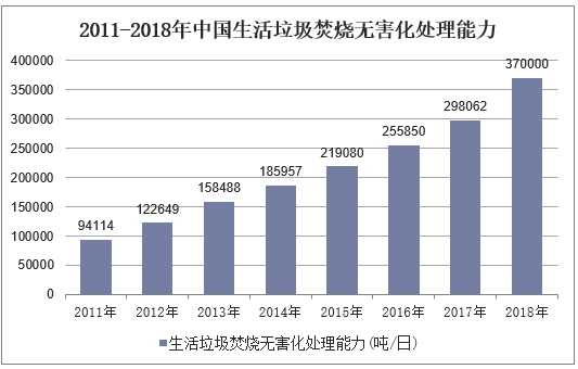 ? ? 我國垃圾焚燒發電行業起步于20世80年代末,通過引進國外先進的焚燒設備和技術,消化吸收優化,先后經歷了產業化研發、裝置國產化等階段。自2005年BOT模式在垃圾焚燒行業大規模推廣開始,行業迎來一波快速發展,2011-2018年中國生活垃圾焚燒無害化處理能力逐年提高,2018年達到37萬噸/日,同比增長24.1%。