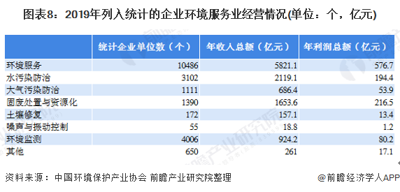 據(jù)我國環(huán)境保護(hù)產(chǎn)業(yè)協(xié)會統(tǒng)計(jì)數(shù)據(jù),2019年1492家固廢處置與資源化企業(yè)實(shí)現(xiàn)營業(yè)收入6591.7億元,實(shí)現(xiàn)營業(yè)利潤598.3億元;3372家水污染防治企業(yè)實(shí)現(xiàn)營業(yè)收入5676.3億元,實(shí)現(xiàn)營業(yè)利潤539.2億元;1366家大氣污染防治企業(yè)實(shí)現(xiàn)營業(yè)收入1904.7億元,實(shí)現(xiàn)營業(yè)利潤143.1億元。