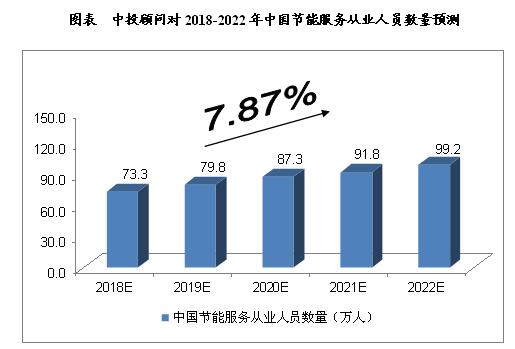 綜合以上因素,我們預計,2018年我國節能服務從業人員數量將達到73.3萬人,未來五年(2018-2022)年均復合增長率約為7.87%,2022年將達到99.2萬人。