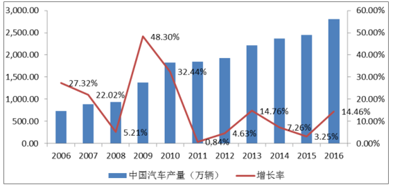? ? 近年來,以中國為代表的發展中國家的汽車行業發展迅速,從 2001年到 2008年,中國汽車工業產銷平均每年跨越一個 100 萬輛臺階。2009 年我國新車產銷量躍居世界第一,并保持至今,汽車工業已毫無爭議地成為我國國民經濟的支柱產業。中國的汽車產量在 2014 年、2015 年和 2016 年分別為2,372.29 萬輛、2,450.33 萬輛、2,811.88 萬輛,同比分別增長 7.26% 、3.25% 和14.46%。